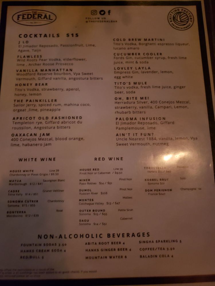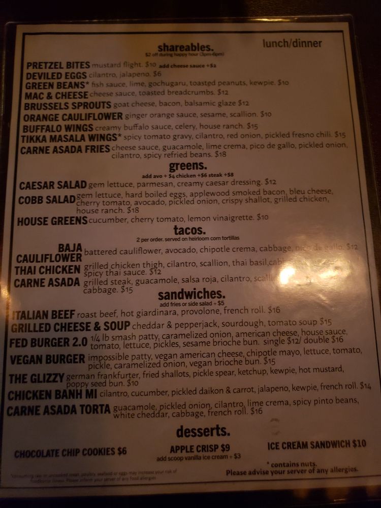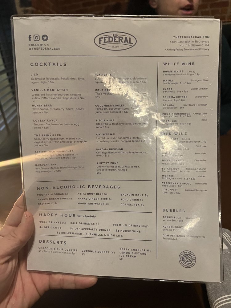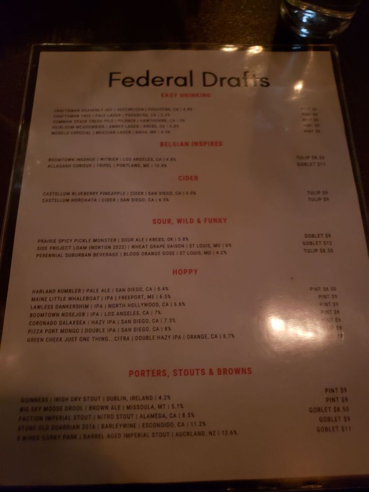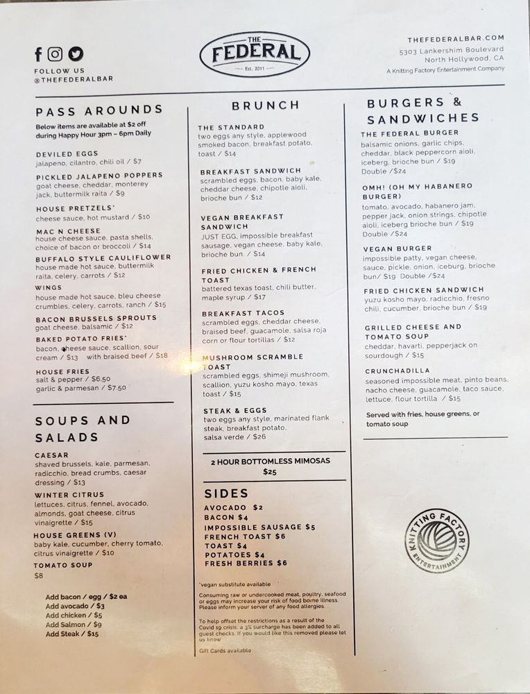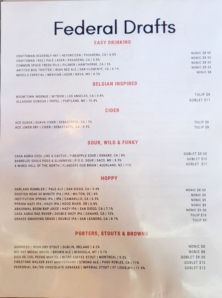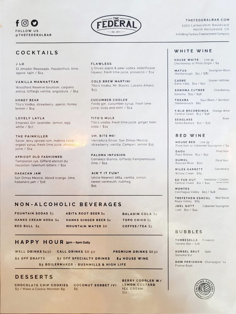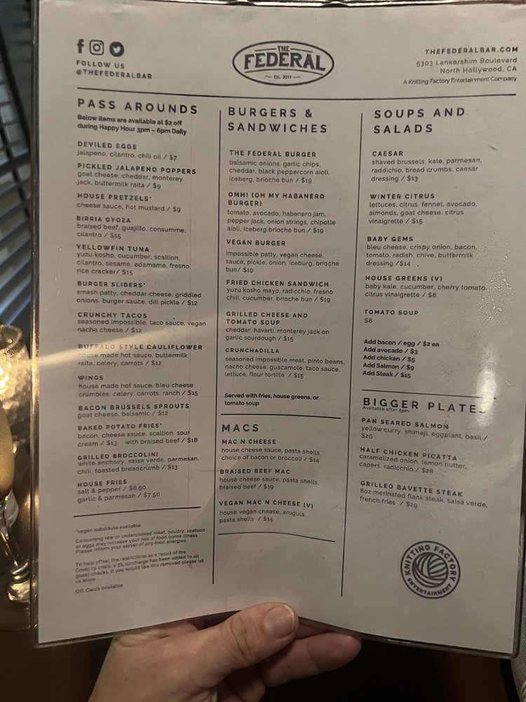 Introducing "The Federal," a trendy and classy gastropub located in the heart of North Hollywood. This restaurant offers a diverse menu with options for pescatarians, vegans, and vegetarians. With a full bar, happy hour specials, and a range of appetizers like Deviled Eggs and House Pretzels, The Federal is perfect for groups looking to enjoy a night out. Standout dishes include the Fed Burger with a smash patty and house sauce, the Vegan Burger with an Impossible patty, and the flavorful Tikka Masala Wings. The ambiance is a mix of vintage 1920s glamour and modern vibes, making it a popular spot for brunch, lunch, dinner, and happy hour. Overall, The Federal impresses with its delicious food, attentive staff, and inviting atmosphere.
